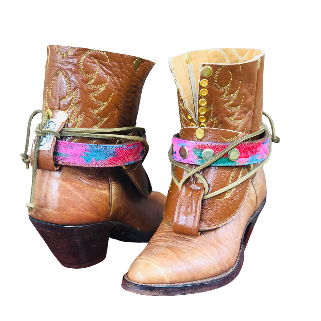 - brown leather with brown leather suede ties, vintage genuine snakeskin belt painted, and gold detail rivets/grommets